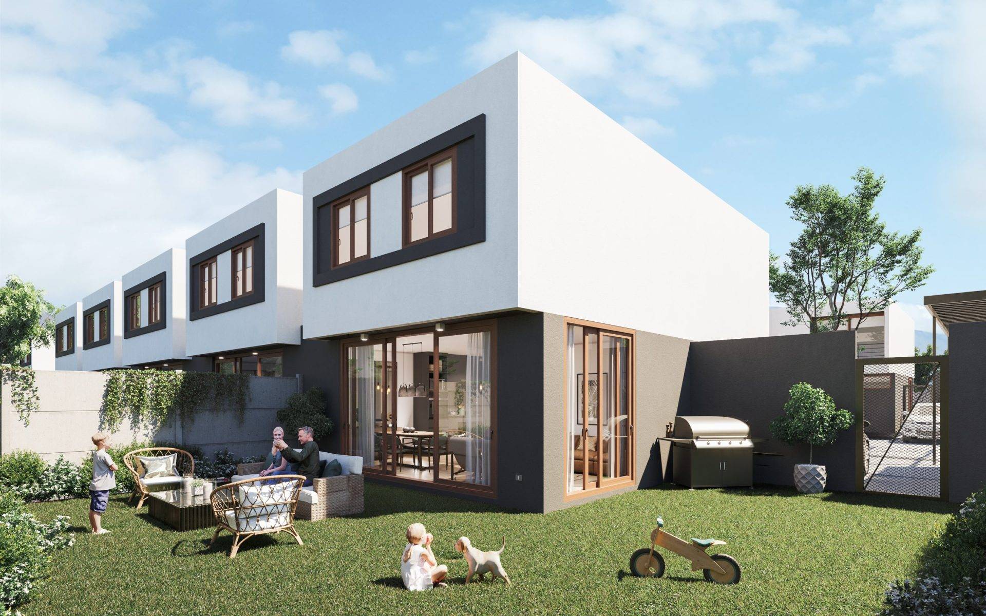 Condomominio de 30 casas de 100 m2 cada una distribuidas en dos pisos, localizado en la comuna de Huechuraba, Santiago. Cada vivienda considera patio privado