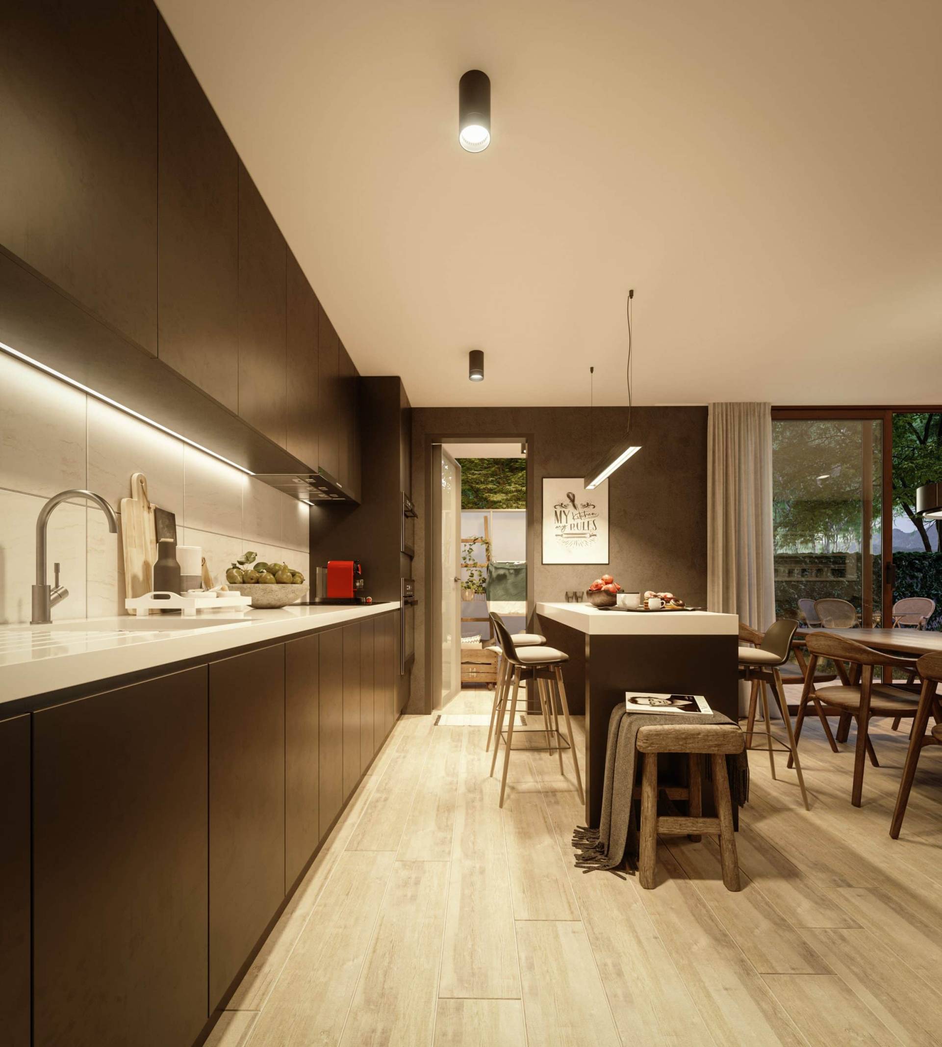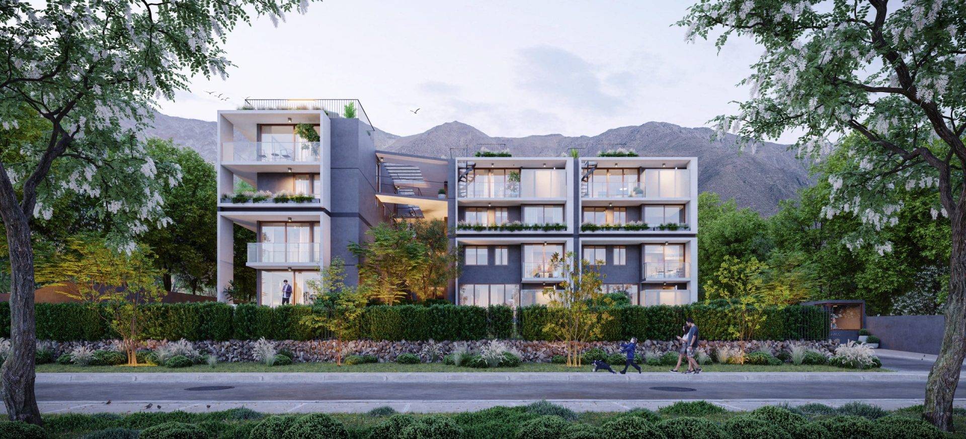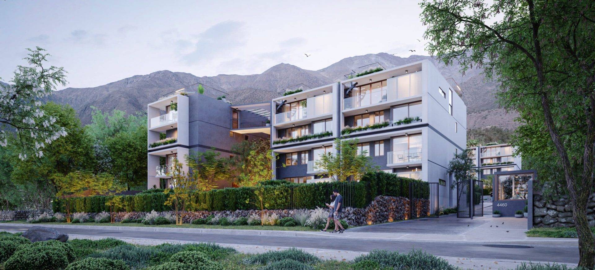 Conjunto residencial de 27 Duplex de 90 y 110 m2 cada uno, distribuidos en 2 edificios de 4 pisos cada uno, localizado en la comuna de Peñalolén, Santiago. Cada vivienda considera patio privado o terraza mirador